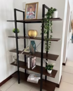 Bring style and functionality to your space with this 5-Tier Industrial Wooden Shelf. Designed with a sturdy black metal frame and rich wooden shelves, it’s perfect for displaying books, plants, décor pieces, or storage baskets. The open design offers a modern, airy look that complements any home office, living room, or bedroom. Its durable construction ensures stability and long-lasting use, while the sleek industrial design adds a touch of sophistication to your home.
